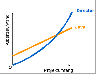 Die große Stärke von Java ist seine Flexibilität. Es sind für fast alle denkbaren Anwendungsmöglichkeiten schon vorgefertigte Klassen verfügbar, die meist selbst in Java geschrieben wurden und teilweise sogar als offener Quellcode verfügbar sind. Die Flexibilität hat jedoch den Nachteil, dass ein Java-Programm in der Regel von Null an geschrieben werden muss. Gerade bei Spielen dauert das Erstellen einer Engine oft mehrere Monate. Dagegen kann Director meist mit schnellen Ergebnissen aufwarten, da Programme auf einem vorgegebenen Programmmodell aufsetzten. Zu diesem gehört zum Beispiel die Verwaltung von Bildern und Tönen und das einfache Ereignismodell, das speziell definierte Skripte auf bestimmte Benutzereingaben hin automatisch ausführt. Die Director-Engine ist auf Multimediaanwendungen spezialisiert und optimiert. Viele Aufgaben, die über diesen Bereich hinausgehen, sind oft nur mit relativ hohem Aufwand zu realisieren, manche können mit dem Director-eigenen Sprachschatz überhaupt nicht zu gelöst werden. Soll in so einem Fall trotzdem nicht auf Director verzichtet werden, müssen aufwändig in C++ geschriebene oder teuer eingekaufte Erweiterungen, sogenannte Xtras, eingesetzt werden. Nachteilig wirkt sich außerdem der überproportional starke Anstieg des Programmieraufwands von Director-Projekten mit dem Umfang der Aufgabenstellung aus. Die folgende Grafik versucht dies stark vereinfacht darzustellen.