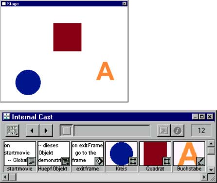 Diese Technik soll nun an einem Beispielprogramm demonstriert werden. Der Directorfilm enthält drei beliebige grafische Objekte in Spritekanal 1 bis 3: