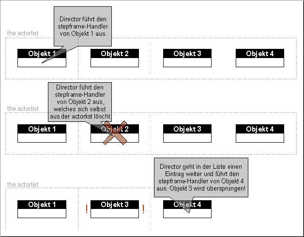 Ein Objekt kann ohne weiteres sich selbst der actorlist hinzufügen, z.B. im new-Handler. Es kann sich auch in der eigenen stepframe-Methode aus der actorlist löschen, auch wenn Macromedia dies nicht empfiehlt12. Dies liegt am Umstand, dass Director beim Abarbeiten der actorlist nicht mit einer Kopie arbeitet und beim Löschen eines Objektes im stepframe-Handler das darauffolgende Objekt überspringt.