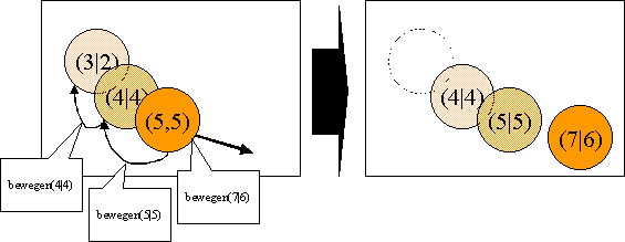 In der bewegen()-Methode wird die Position des Sprites auf einen gegebenen Wert gesetzt. Bevor dies geschieht, wird aber noch die bewegen()-Methode des Nachfolgers aufgerufen, um diesen dorthin zu bewegen, wo das aktuelle Segment jetzt ist. Beachten Sie, dass dieser wiederum seinen Nachfolger aufruft, sofern er einen hat, usw.