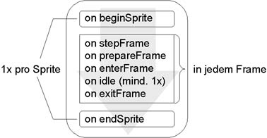 | on beginSprite | Spriteskript, Frameskript | Wird ausgeführt, wenn der Abspielkopf auf ein Sprite trifft, das im vorherigen Frame noch nicht existierte. |